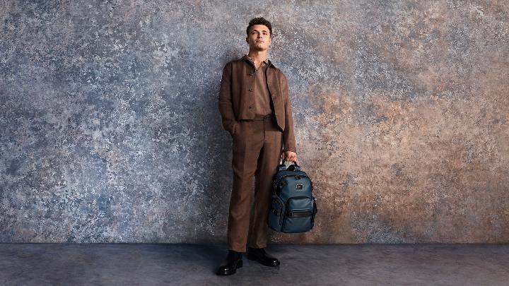 Pembalap Tim McLaren Formula 1 Lando Norris dengan Alpha Bravo Navigation Backpack dalam material Navy Coated Canvas. Foto: TUMI